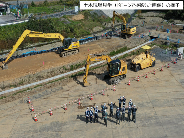 三日目、南三陸町で施工中の河川災害復旧工事(土木工事)の現場にて見学、ドローン操縦体験をし、登米市内の学校体育館改修工事では職人の技術やクレーン作業の見学を行いました。